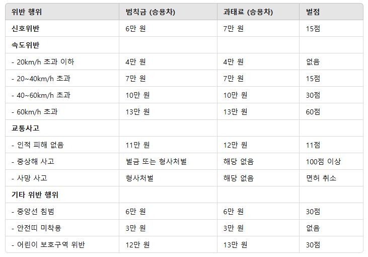 1. 도로교통 위반에 따른 범칙금 및 벌점
